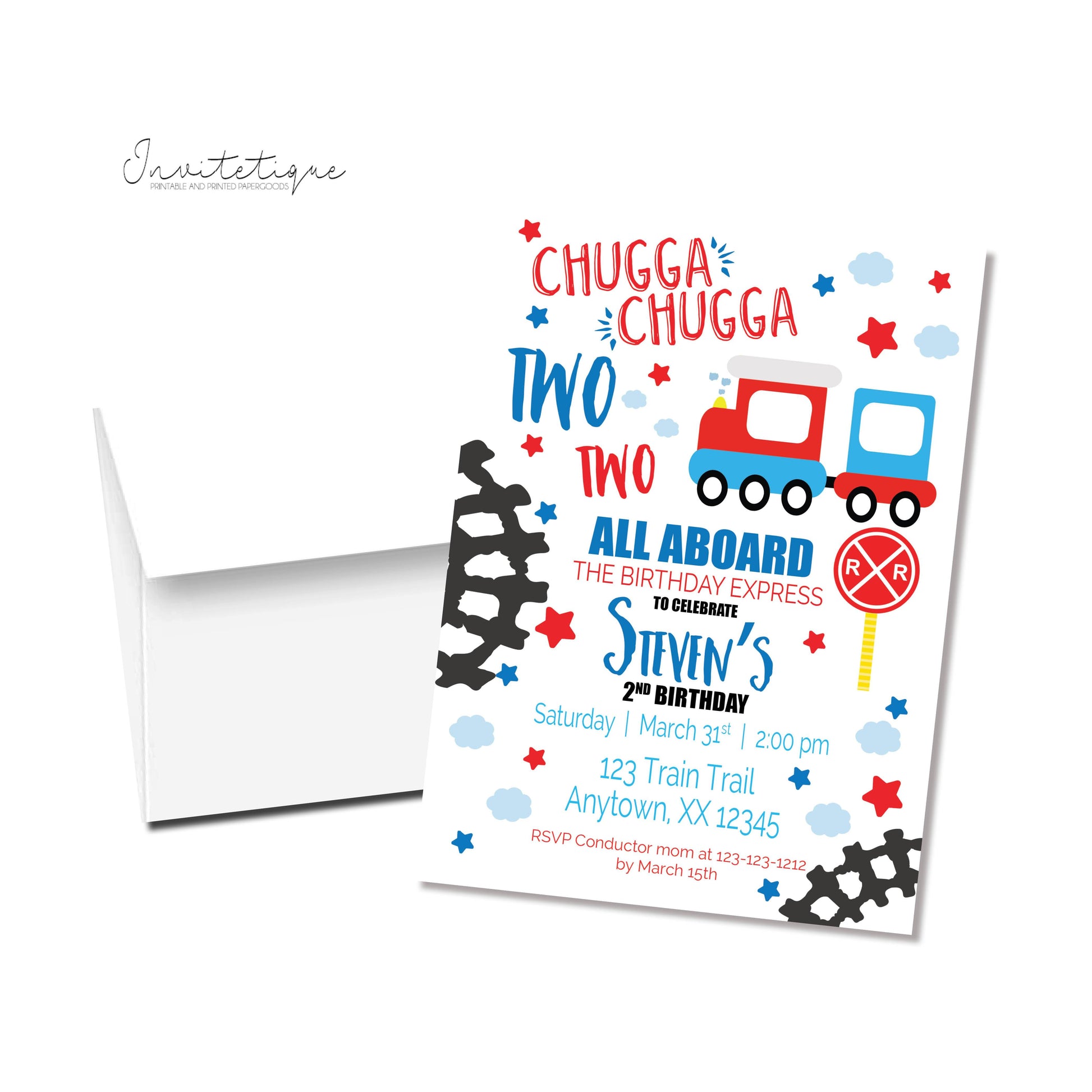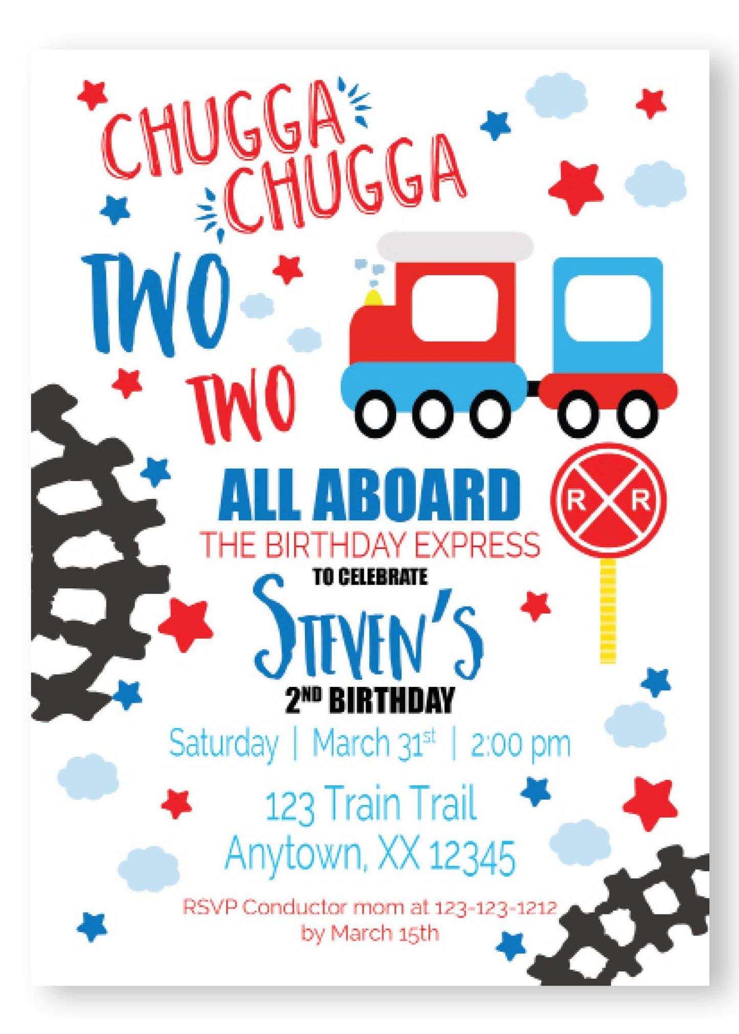 Printable Chugga Chugga Two Two-Train Birthday Party Invitation. Boy train birthday party invitations are perfect for your child's second birthday party or any age's birthday!