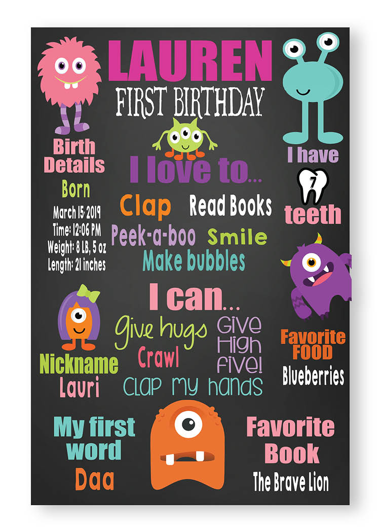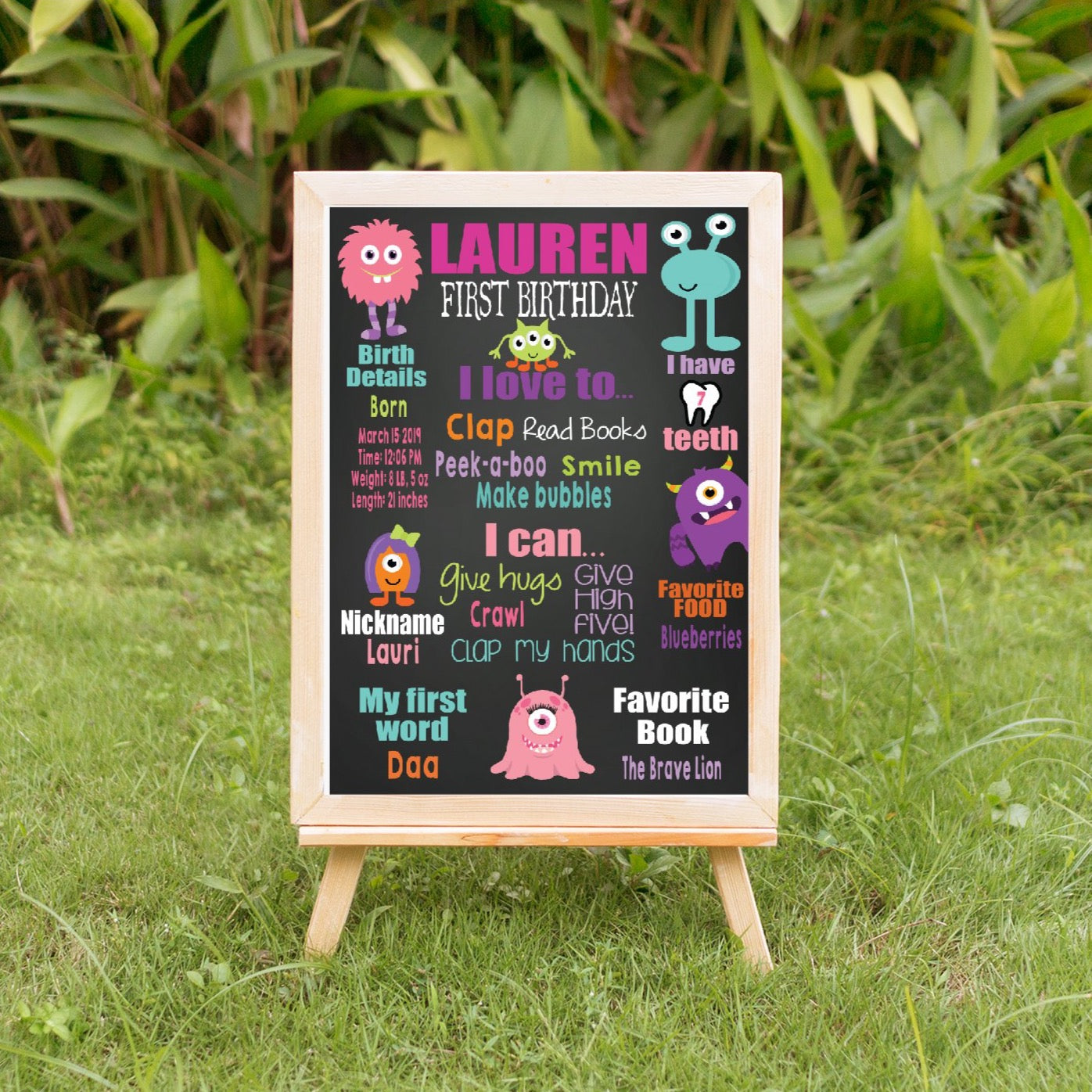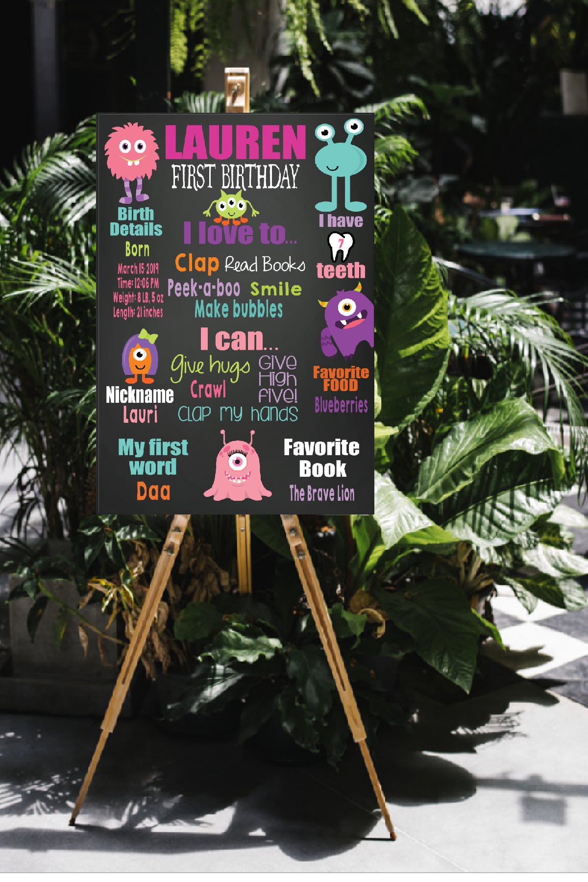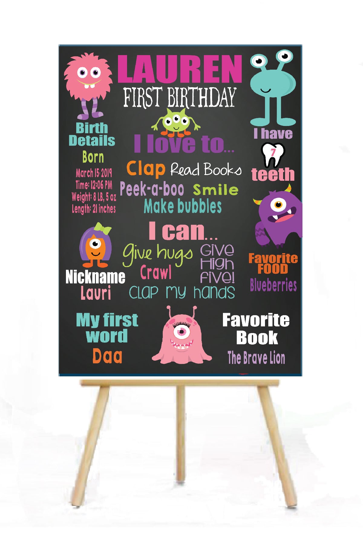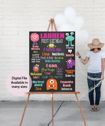 Little Monster Girl Birthday milestone board, Monster Birthday milestone poster, Personalized, Custom Sign is the perfect addition to your party decoration. You can also place this sign on a mini table easel, in a photo frame, in an easel, or on a wall to guide guests, and add a unique touch to your special event!