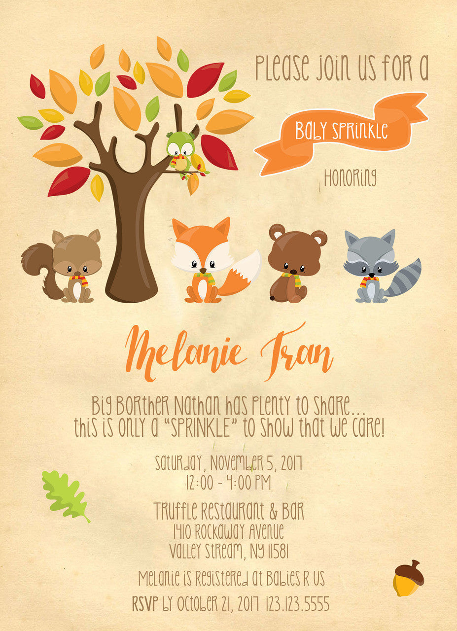 Celebrate your baby upcoming arrival with this Sweet Woodland Baby Sprinkle Invite!