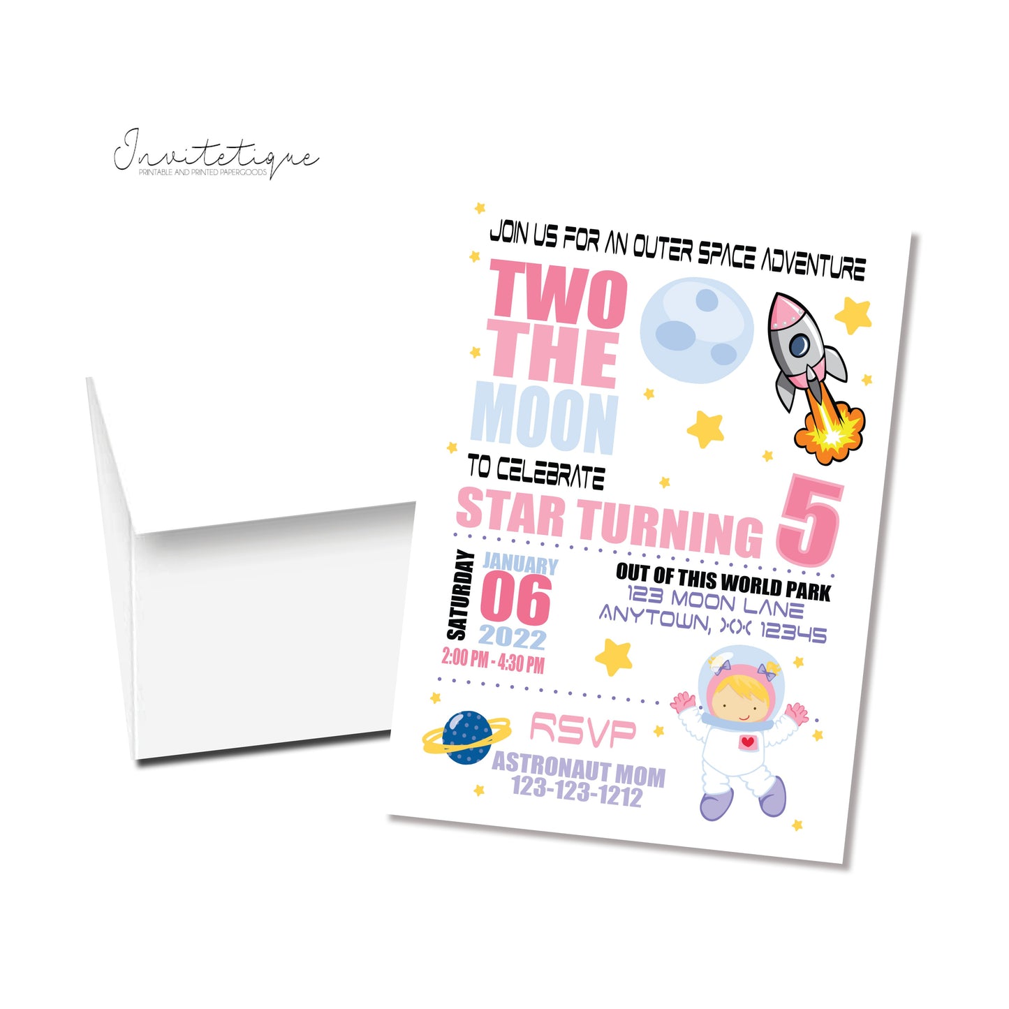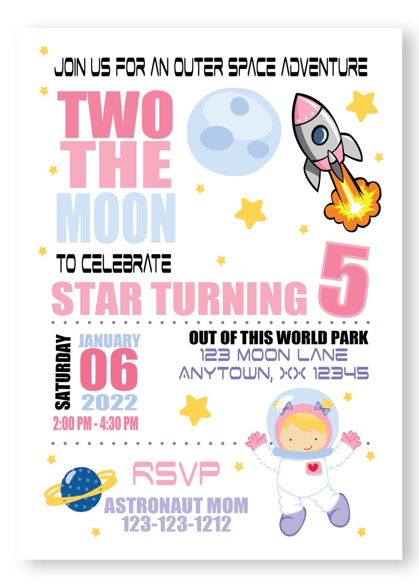 Launch your party invites with this Two-the-moon girly Space Birthday Party Invitation. Featuring a rocket ship, stars, and a friendly astronaut, this outer space party invitation is perfect for your child's first birthday party or any age's birthday!