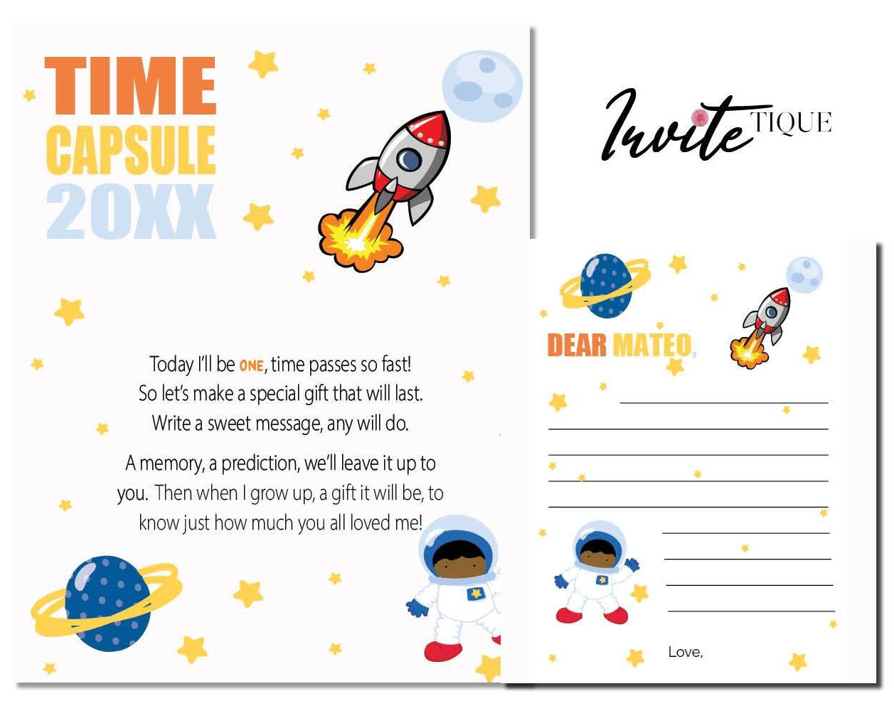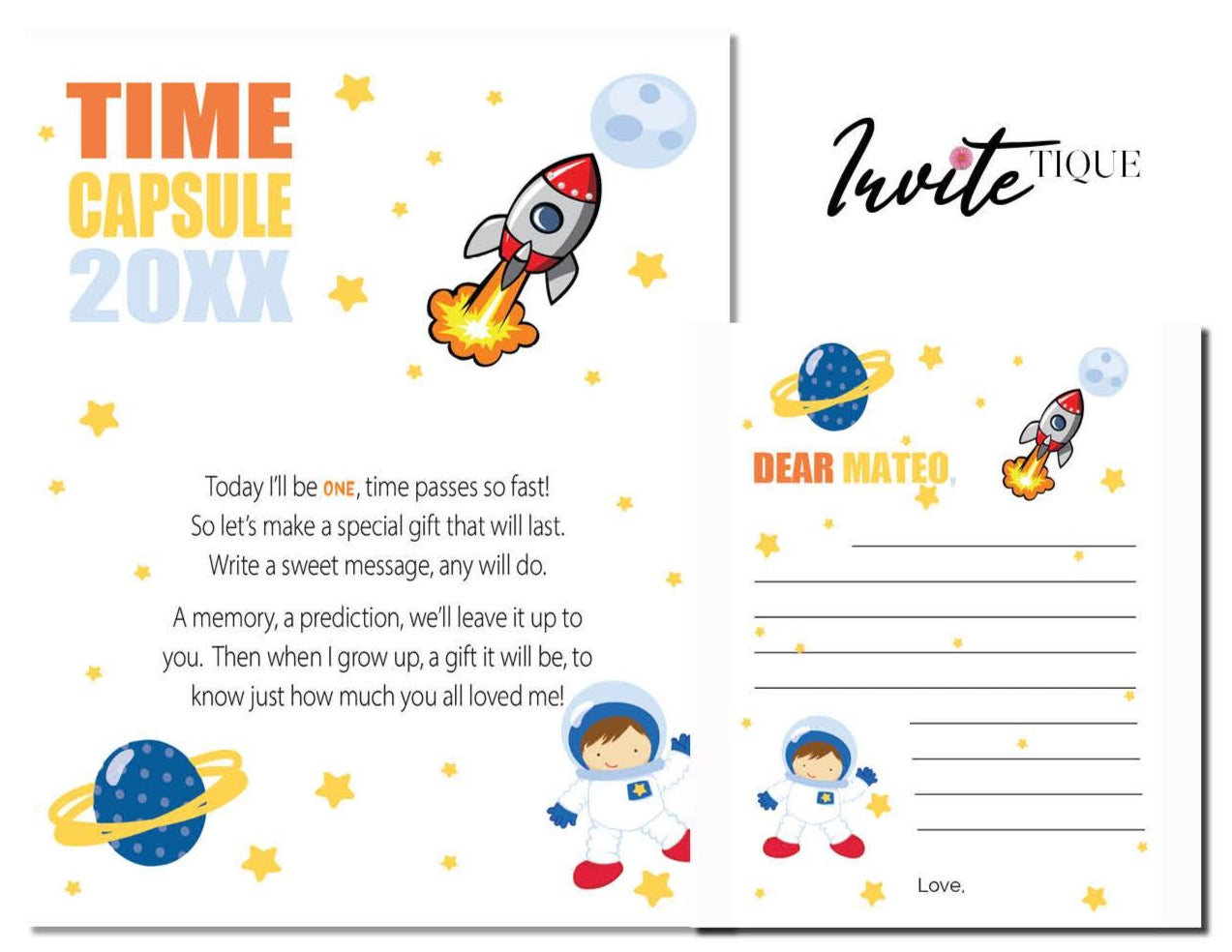 This listing is for a high resolution Time Capsule Sign and a for a the matching Message Card in digital form. This listing does NOT include changes to color, font, or design. You will receive the poster and the cards you see with your child's personalized information.