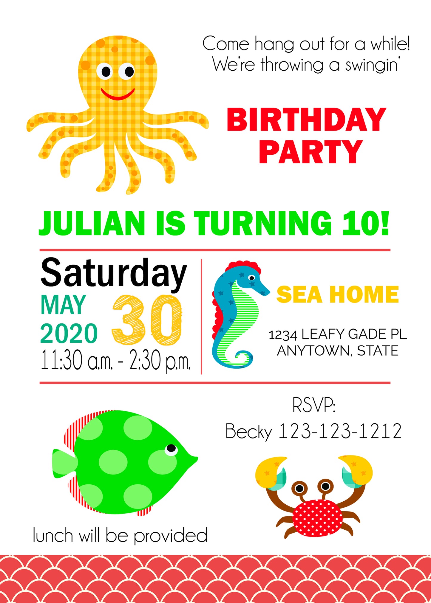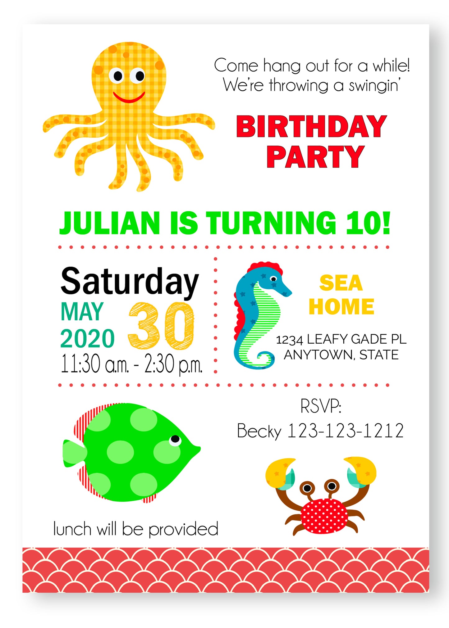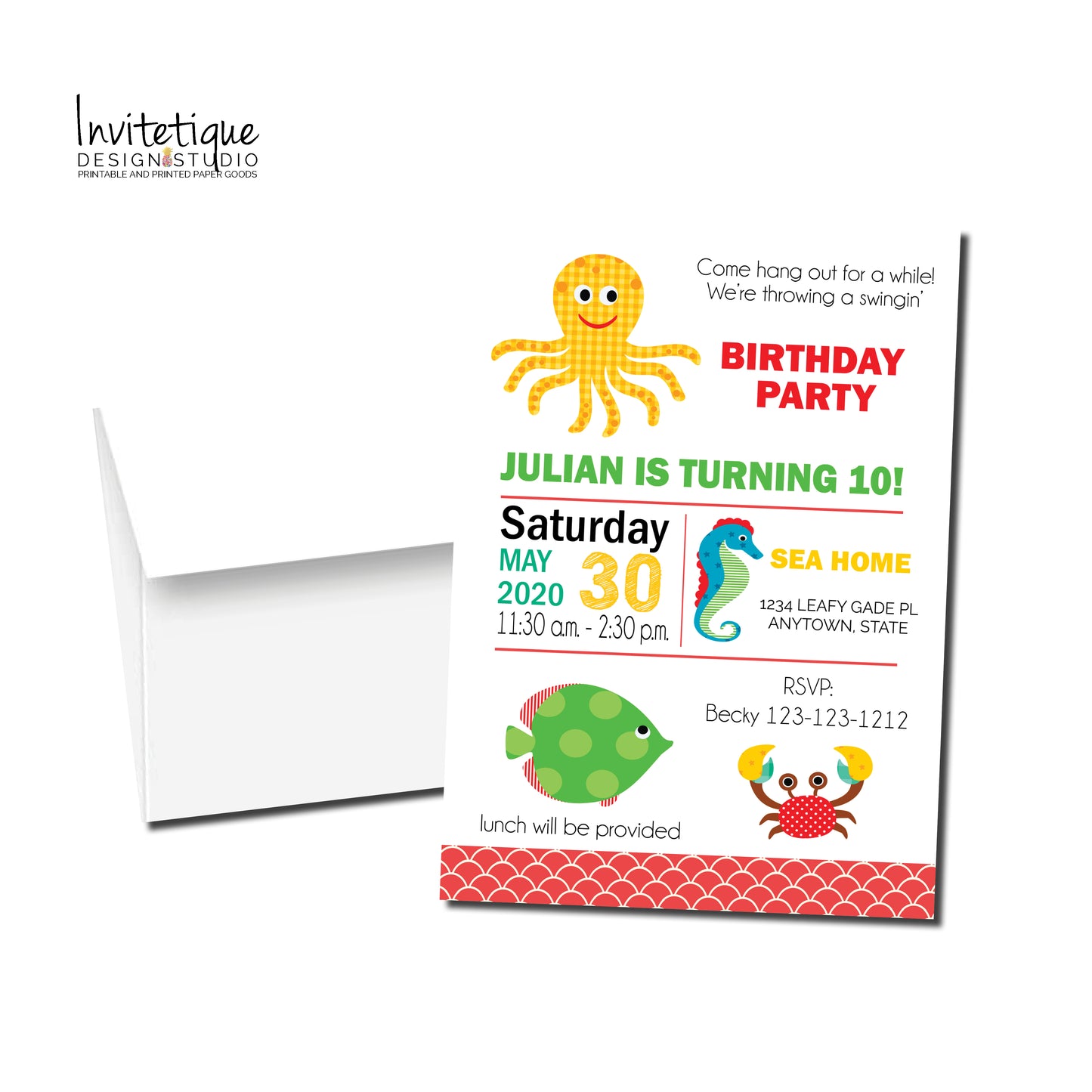 Under the Sea, Invitations features fun sea creatures, octopuses, fish, seahorses, and more. Perfect for an ocean-themed baby shower or birthday party. Customize this invitation with your own colors, fonts, and wording to suit your event